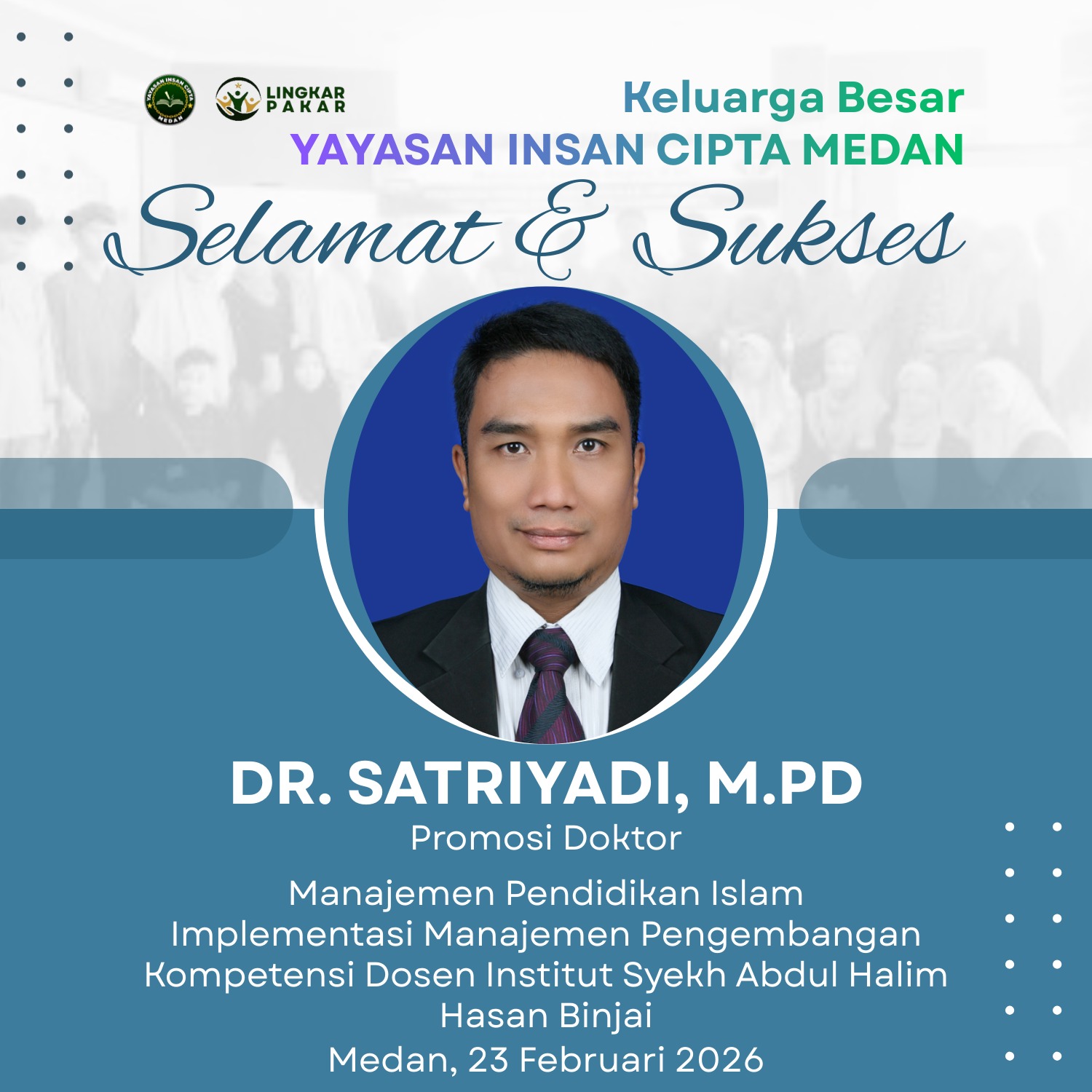 Senin, 23 Februari 2026 ketua Yayasan Insan Cipta Medan menghadiri sidang promosi doktor pembina Yayasan Insan Cipta Medan, Satriyadi, M.Pd. Sidang promosi berlangsung di ruang sidang gedung FITK UINSU Medan, Jalan Williem Iskandar, Medan...